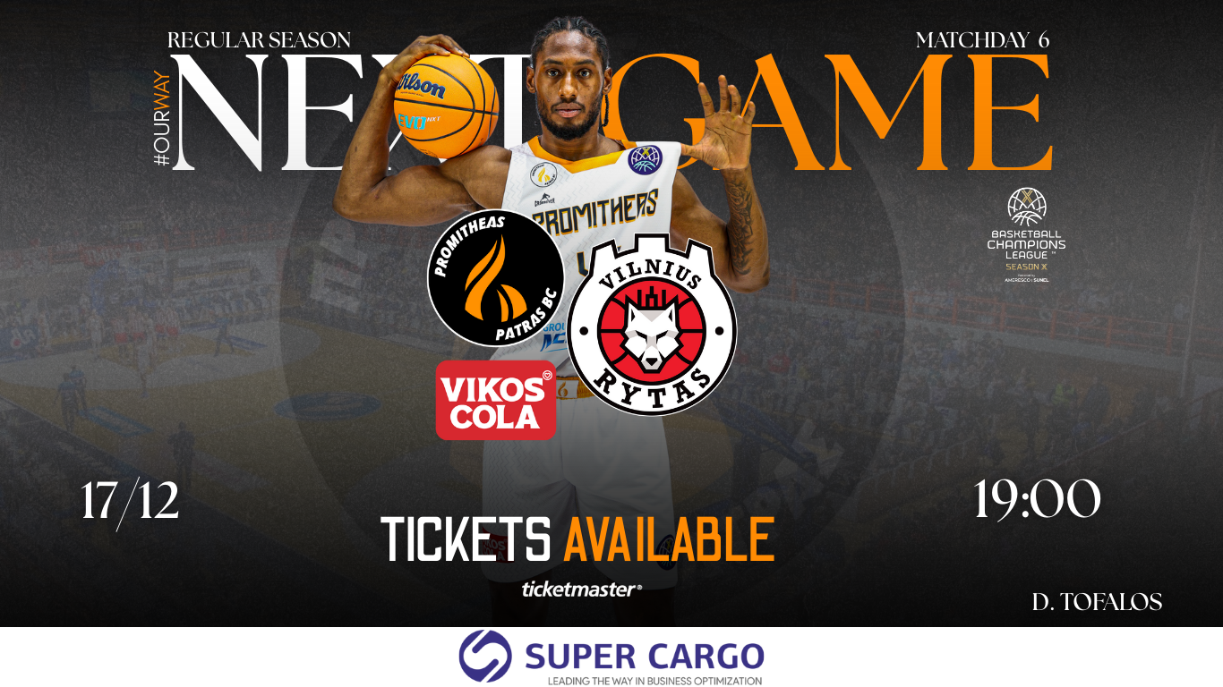 Ο Προμηθέας Βίκος Cola υποδέχεται στο Δ. Τόφαλος την λιθουανική Rytas Vilnius την Τετάρτη 17 Δεκεμβρίου για την 6η και τελευταία αγωνιστική των ομίλων της πρώτης φάσης του Basketball Champions League.